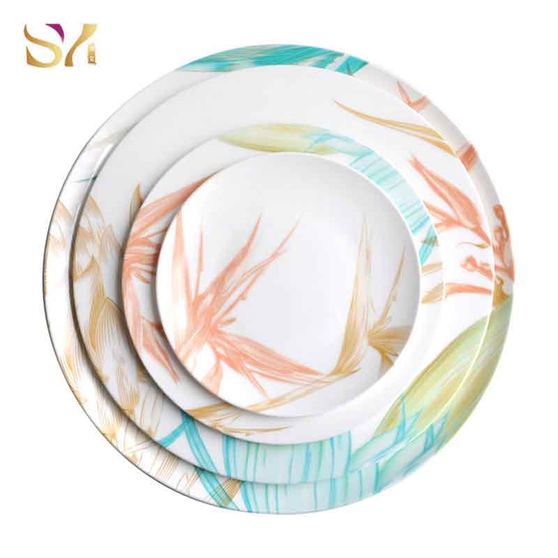 Full white bone china everyday dishes set color leaf crockery includes:12 inch charger plate,10.5 inch dinner plate,8 inch dessert plate,6.5 inch bread plate.