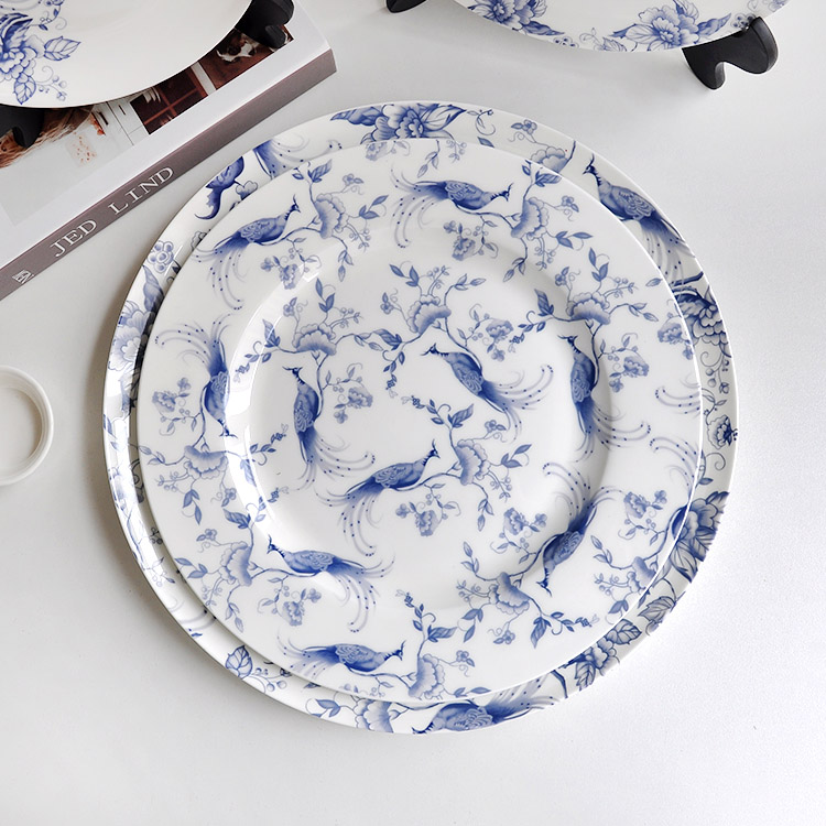 Full classy blue and white ceramics dinner plate sets service includes:12 inch charger plate,10.5 inch dinner plate,8 inch dessert plate,6.5 inch bread plate.