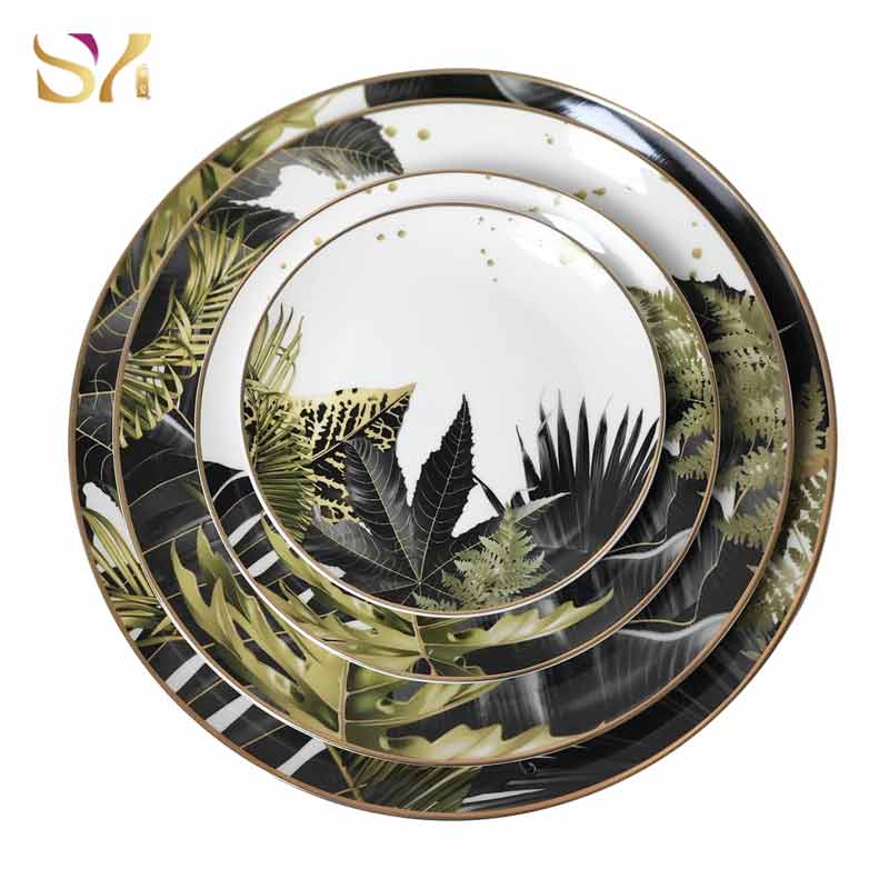 Full green and gold leaves ceramic dinner dishes set includes:12 inch charger plate,10.5 inch dinner plate,8 inch dessert plate,6.5 inch bread plate.