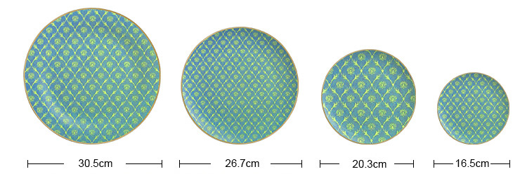 Full green ceramic dinner service set includes:12 inch charger plate,10.5 inch dinner plate,8 inch dessert plate,6.5 inch bread plate.