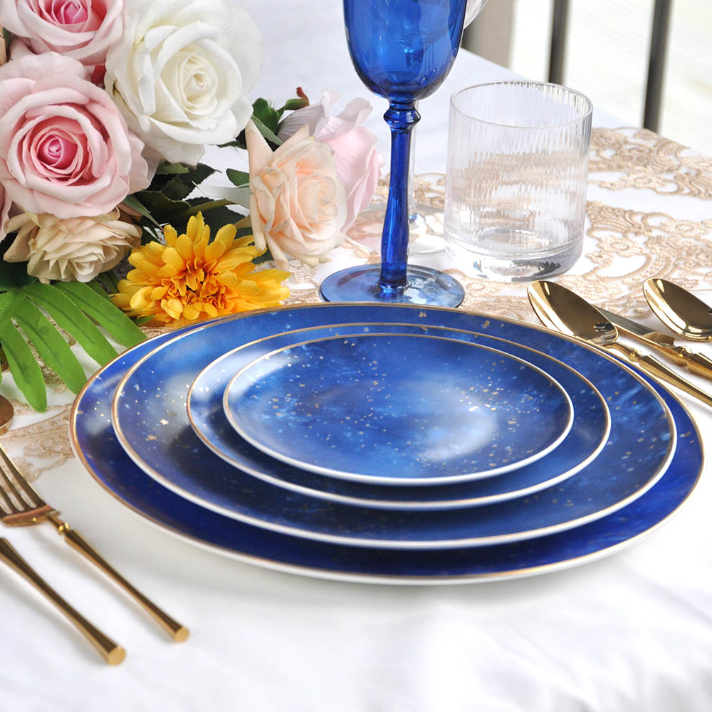 Full navy blue and gold crockery dinner plates set includes:12 inch charger plate,10.5 inch dinner plate,8 inch dessert plate,6.5 inch bread plate.