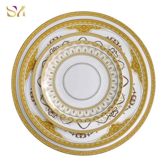 Full royal gold patterned dinnerware dinner set includes:12 inch charger plate,10.5 inch dinner plate,8 inch dessert plate,6.5 inch bread plate.