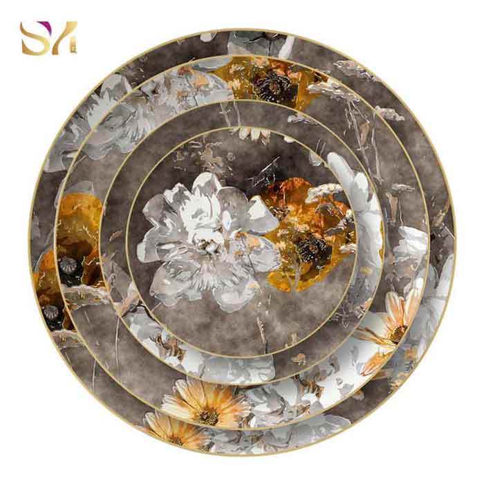 Full beautiful floral ceramic gold rim dessert plates set includes:12 inch charger plate,10.5 inch dinner plate,8 inch dessert plate,6.5 inch bread plate.