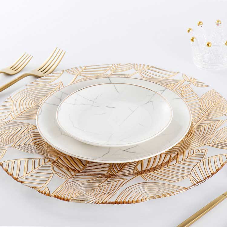 Wholesale factory custom 13'' leaves gold glass charger plates for formal wedding fiesta party hotel restaurant bar are with high quality and competitive price more different styles from china glassware manufacturers.This style of charger tray, we have two colors to choose from gold and silver.