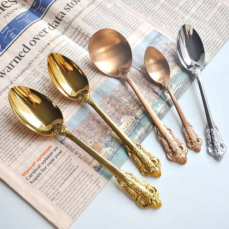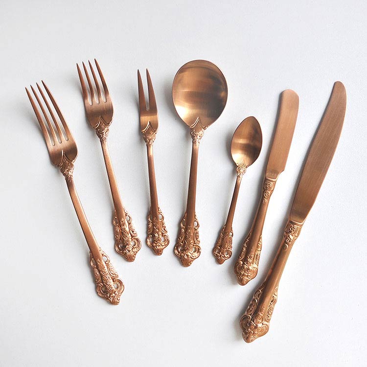 Rose gold baroque flatware cutlery set include:dinner knife,dessert knife,butter knife,steak knife,dinner fork,salad fork,dessert fork,fruit fork,cake fork,cocktail fork,dinner spoon,dessert spoon,soup spoon,ice spoon,teaspoon,coffee spoon,chopsticks.