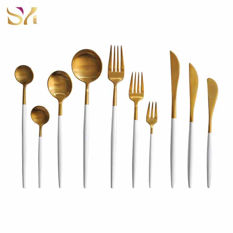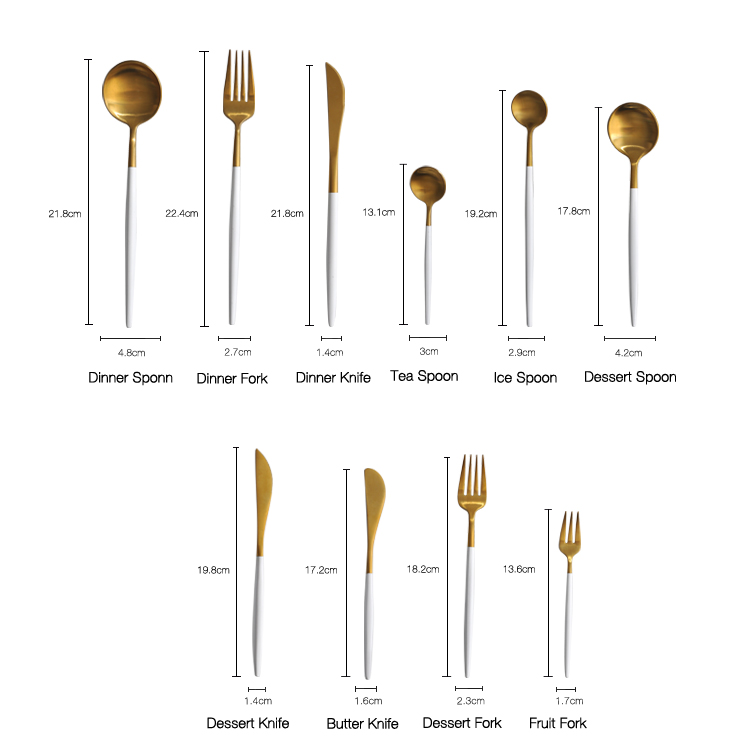 white handle and gold stainless steel cutlery flatware set include:dinner knife,dessert knife,butter knife,steak knife,dinner fork,salad fork,dessert fork,fruit fork,cake fork,cocktail fork,dinner spoon,dessert spoon,soup spoon,ice spoon,teaspoon,coffee spoon,chopsticks.