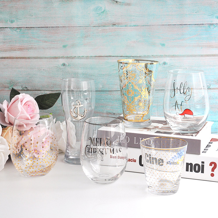 Clear glass personalised clear glass stemless white wine glasses customize, we can customize the logo, color, handle color/length, wine glass diameter, base width, etc. You can provide the size data of the wine glass you want, and we will produce it according to the data you provide.