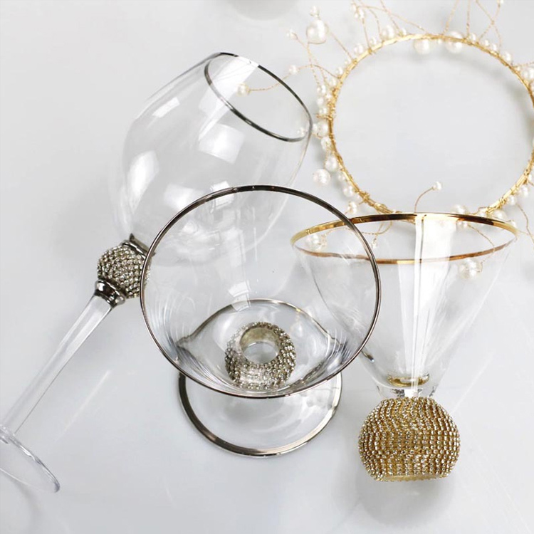 Full rhinestone studded trinkware gold rimmed wine glasses set includes:red wine glasses, white wine glass,champagne glasses,champagne coupe,martini cocktail glass,brandy cognac glasses,stemless wine glasses, long/short stem wine glasses etc.